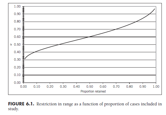In other situations, the authors of primary studies select individuals scoring in the top or bottom of a certain percentile range (e.g., selection of those above the median of a variable for inclusion is equivalent to selecting the top 50th percentile). In these situations, it is possible to compute the amount that the range is restricted. Although such calculations are complicated (see Barr & Sherrill, 1999), Figure 6.1 shows the values of u given the proportion of individuals selected for the study. The x-axis of this figure represents the proportion of individuals included in the study (e.g., selection of all individuals above the 10th percentile means retention of 0.90 of participants). It can be seen that the less selective a study is (i.e., a higher proportion is retained, shown on the right side of the figure), the less restricted the range (i.e., u approaches 1), whereas the more selective a study is (i.e., a lower proportion is retained, shown on the left side of the figure), the more restricted the range (i.e., u becomes smaller). Note that the computations on which Figure 6.1 is based assume a normal distribution of the variable within the reference population and are only applicable with one-sided truncated data (i.e., the research selected individuals based on their falling above or below a single score or percentile cutoff).