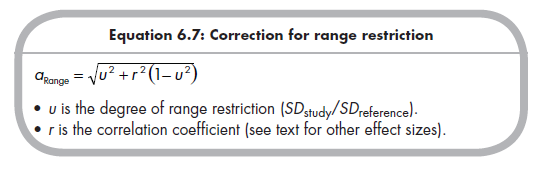 Another situation of range restriction is that of restriction on both variables comprising the effect size. In the example involving GRE scores and graduate school success, the sample may be restricted in terms of both selection on GRE scores (i.e., only individuals with high scores are accepted into graduate schools) and graduate school success (e.g., those who are unsuccessful drop out of graduate programs). This is an example of range restriction on both variables of the effect size, or double-range restriction (also called “doubly truncated” by Alexander, Carson, Alliger, & Carr, 1987). Although no exact methods exist for simultaneously correcting range restriction on both variables (Hunter & Schmidt, 2004, p. 40), Alexander et al. (1987) proposed an approximation in which one corrects first for restriction in range of one variable and then for restriction of range on the second variable (using the r corrected for range restriction on the first variable in Equation 6.7). Alexander et al. (1987) show that this approximation is generally accurate for most situations meta-analysts are likely to encounter, and Hunter and Schmidt (2004) report that this approximation can be used to correct for either direct or indirect range restriction.