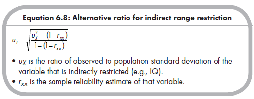 This situation of indirect range restriction may be more common than that of direct range restriction that I have previously described (Hunter et al., 2006). It is also more complex to correct. Although I direct readers interested in a full explanation to other sources (Hunter & Schmidt, 2004, Ch. 3; Hunter et al., 2006; Le & Schmidt, 2006), I briefly describe this procedure. First, you need to consider both the sample standard deviation of the indirectly restricted variable (e.g., IQ, if GRE scores are used for selection and are associated with IQ) as well as the reliability of this restricted variable. You then compute an alternative value of u for use in Equation 6.7. Specifically, you compute this alternative ratio, denoted as uj by Hunter and Schmidt (2004; Hunter et al., 2006, p. 106) using the following formula: