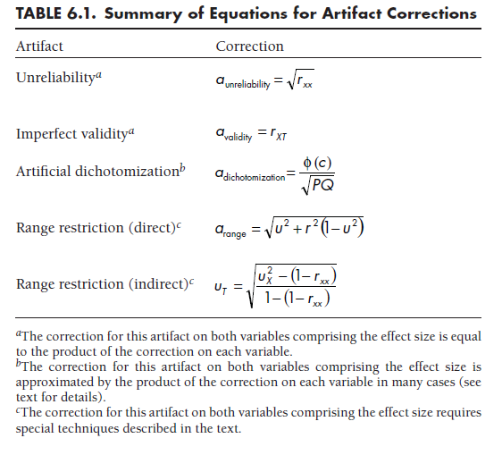 ficial dichotomization of continuous variables, and range restriction of variables. Next I describe the conceptual justification and computational details of each of these corrections. The computations of these artifact corrections are summarized in Table 6.1.