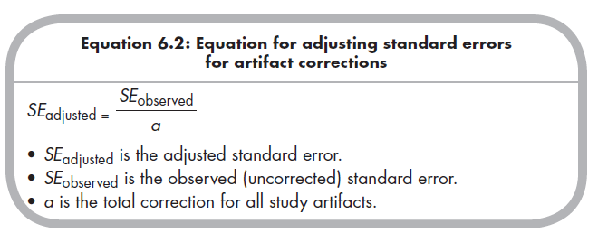 Artifact adjustments to effect sizes also require adjustments to standard errors. Because standard errors represent the imprecision in estimates of effect sizes, it makes conceptual sense that these would increase if you must make an additional estimate in the form of how much to correct the effect size. Specifically, the standard errors of effect sizes (e.g., r, g, or o; see Chapter 5) are also adjusted for artifact correction using the following general formula:
