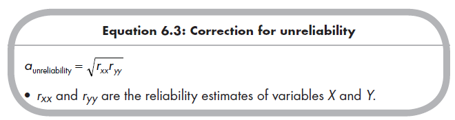 Before ending discussion of correction for unreliability, I want to mention the special case of latent variable associations. These latent variable associations include (1) correlations between factors from an exploratory factor analysis with oblique factor rotation (e.g., direct oblimin, promax), and (2) correlations between constructs in confirmatory factor analysis models.4 You should remember that these latent correlations are corrected for measurement error; in other words, the reliabilities of the latent variable are perfect (i.e., 1.0). Therefore, these latent correlations are treated as effect sizes already corrected for unreliability, and you should not further correct these effect sizes using Equation 6.3. This point can be confusing because many primary studies will report internal consistencies for these scales; but these internal consistencies are relevant only if the study authors had conducted manifest variable analyses (e.g., using summed scale scores) with these measures.