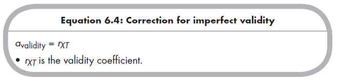 You can conceptualize a measure’s degree of validity as the disattenu- ated correlation between the measure and the construct. In other words, the validity of a measure (X) in assessing a construct (T) is txt when the measure is perfectly reliable. If the effect size of interest in your meta-analysis is the association between the true construct (T) and some other variable (Y; assuming for the moment that this variable is measured with perfect validity), then the association you are interested in might be represented as tty (you could also apply this correction to other effect sizes, but the use of correlations here facilitates understanding). Therefore, the observed association between the measure (X) and the other variable (Y) is equal to the product of the validity of the measure and the association of the construct with the other variable, txy = txt * tty. To identify the association between the construct (T) and the other variable (Y), which is what you are interested in, you can rearrange this expression to tty = txy/txt In other words, the adjustment for imperfect validity in a study is: