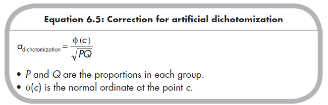 Corrections for one variable that is artificially dichotomized are straightforward. You need only to know the numbers, proportion, or percentages of individuals in the two artificial groups. Based on this information, the artifact adjustment for dichotomization of one variable is (Hunter & Schmidt, 1990; Hunter & Schmidt, 2004, p. 36; MacCallum et al., 2002):