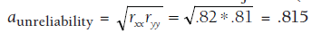 Here, a is the total correction for all study artifacts and is simply the product of the individual artifacts described next (i.e., a = a1 * a2 * . . . , for the first, second, etc., artifacts for which you wish to correct).2 Each individual artifact (ai) and the total product of all artifacts (a) have values that are 1.0 (no artifact bias) or less (with the possible exception of the correction for range restriction, as described below). The values of these artifacts decrease (and adjustments therefore increase) as the methodological limitations of the studies increase (i.e., larger problems, such as very low reliability, result in smaller values of a and larger corrections).