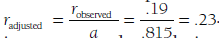An illustration using a study from the ongoing example meta-analysis (Card et al., 2008) helps clarify this point. This study (Hawley, Little, & Card, 2007) reported a bivariate correlation between relational aggression and rejection of r = .19 among boys (results for boys and girls were each corrected and later combined). However, the measures of both relational aggression and rejection exhibited marginal internal consistencies (as = .82 and .81, respectively), which might have contributed to an attenuated effect size of this correlation. To estimate the adjusted (corrected) correlation, I compute first