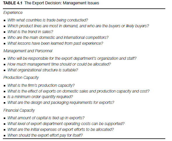 To achieve success, there must be a strong and lasting management commitment to the export business. The long-term commitment is necessary to ensure the recovery of high market-entry costs related to product modification, legal representation, and advertising, as well as the development of an agent/distributor network (see Table 4.1).