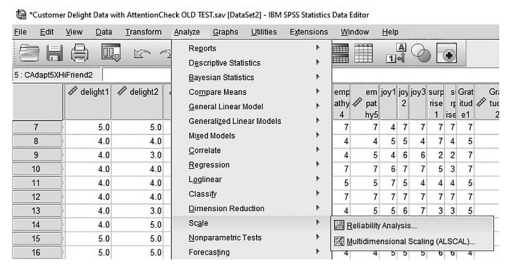 Let’s go back to our example with the three indicators measuring customer delight, and let’s determine the reliability of those indicators to capture delight. To calculate Cronbach’s alpha, you need to go to the SPSS file where your data is located. Next, go to the Menu func- tion “Analyze”, then go to “Scale”, then to “Reliability Analysis”.