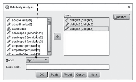 A pop-up window will appear where you will select your construct’s indicators of interest. In this case, we are going to select all three delight indicators. Make sure the model selection is listed as “Alpha”.