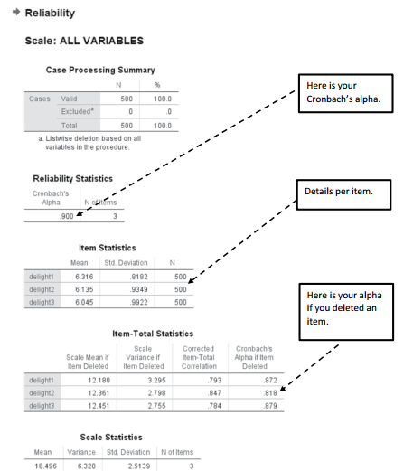 In the output (see Figure 2.11), the Cronbach’s alpha value is .900, which is well above the .70 criteria of acceptable reliability. By including the “Item” statistics in the output, you can see if one indicator has a large standard deviation, which could contribute to unreliability if this is present. Lastly, the “Scale if item deleted” presents the change in Cronbach’s alpha if an item was removed.