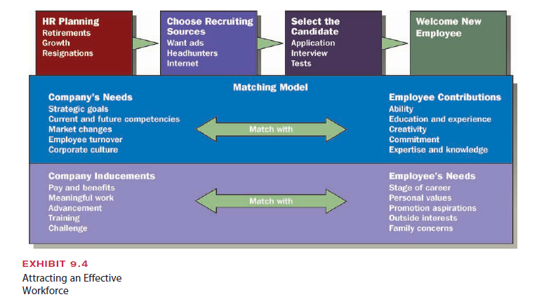 Underlying the organization’s effort to attract employees is a matching model. With the matching model, the organization and the individual attempt to match the needs, inter- ests, and values that they offer each other.41 HRM professionals attempt to identify a correct match. For example, a small software developer might require long hours from creative, technically skilled employees. In return, it can offer freedom from bureaucracy, tolerance of idiosyncrasies, and potentially high pay. A large manufacturer can offer employment security and stability, but it might have more rules and regulations and require greater skills for “getting approval from the higher-ups.” The individual who would thrive working for the software developer might feel stymied and unhappy working for a large manufacturer. Both the company and the employee are interested in finding a good match.