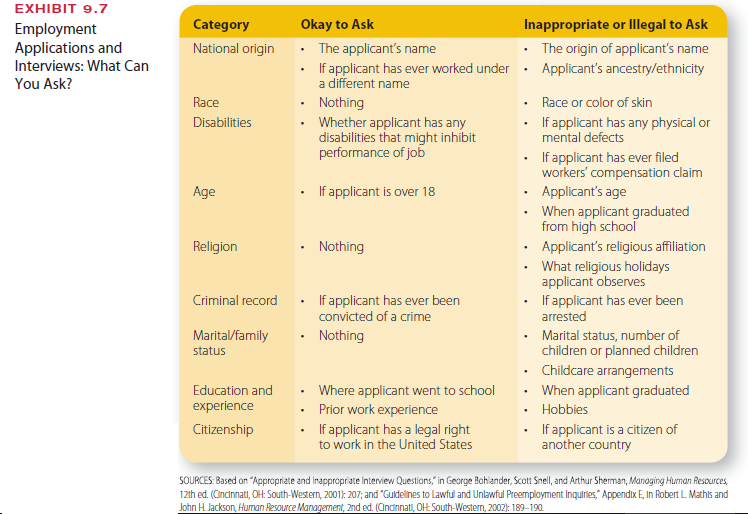 The interview serves as a two-way communication channel that allows both the organiza- tion and the applicant to collect information that would otherwise be difficult to obtain. This selection technique is used in almost every job category in nearly every organization. It is another area where the organization can get into legal trouble if the interviewer asks questions that violate EEO guidelines. Exhibit 9.7 lists some examples of appropriate and inappropriate interview questions.