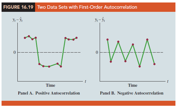 One of the assumptions of the regression model is the error terms are independent. However, when autocorrelation is present, this assumption is violated. In the case of first-order autocorrelation, the error at time t, denoted ∈t, will be related to the error at time period t – 1, denoted ∈t-1. Two cases of first-order autocorrelation are illustrated in Figure 16.19. Panel A is the case of positive autocorrelation; panel B is the case of negative autocorrelation. With positive autocorrelation we expect a positive residual in one period to be followed by a positive residual in the next period, a negative residual in one period to be followed by a negative residual in the next period, and so on. With negative autocorrelation, we expect a positive residual in one period to be followed by a negative residual in the next period, then a positive residual, and so on.