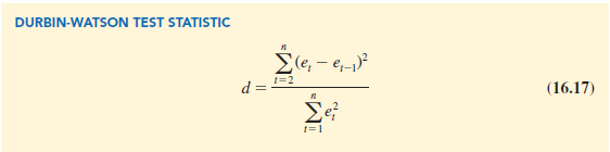 The Durbin-Watson test for autocorrelation uses the residuals to determine whether p = 0. To simplify the notation for the Durbin-Watson statistic, we denote the ith residual by e, = yi – yt. The Durbin-Watson test statistic is computed as follows: