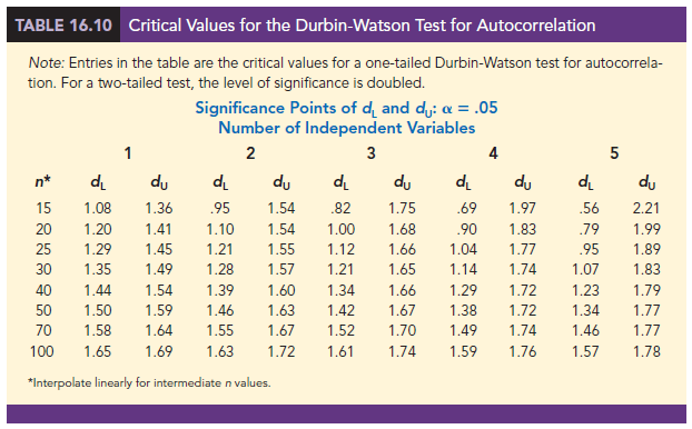 The Durbin-Watson test statistic ranges in value from zero to four, with a value of two indicating no autocorrelation is present. Durbin and Watson developed tables that can be used to determine when their test statistic indicates the presence of autocorrelation. Table 16.10 shows lower and upper bounds (dL and d∪) for hypothesis tests using a = .05; n denotes the number of observations. The null hypothesis to be tested is always that there is no autocorrelation.