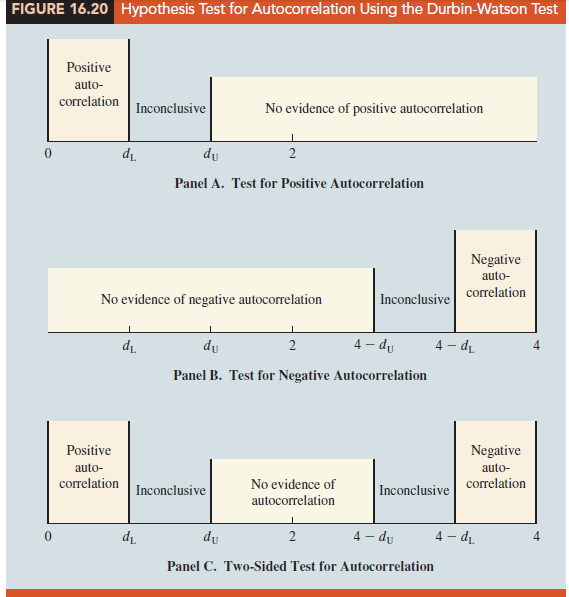 Figure 16.20 shows how the values of dL and d∪ in Table 16.10 are used to test for autocorrelation. Panel A illustrates the test for positive autocorrelation. If d < dL, we conclude that positive autocorrelation is present. If dL ≤ d ≤ d∪, we say the test is inconclusive. If d > d∪, we conclude that there is no evidence of positive autocorrelation.
