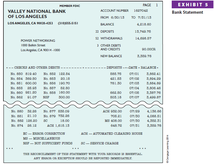 The cash balance shown by a bank statement is usually different from the company’s cash balance, as shown in Exhibit 6.