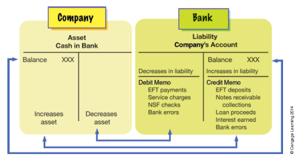The company’s checking account balance in the bank records is a liability. Thus, in the bank’s records, the company’s account has a credit balance. Since the bank statement is prepared from the bank’s point of view, a credit memo entry on the bank statement indicates an increase (a credit) to the company’s account. Likewise, a debit memo entry on the bank statement indicates a decrease (a debit) in the company’s account. This relationship is shown below.
