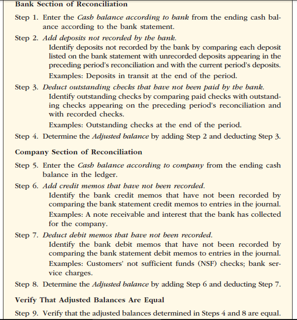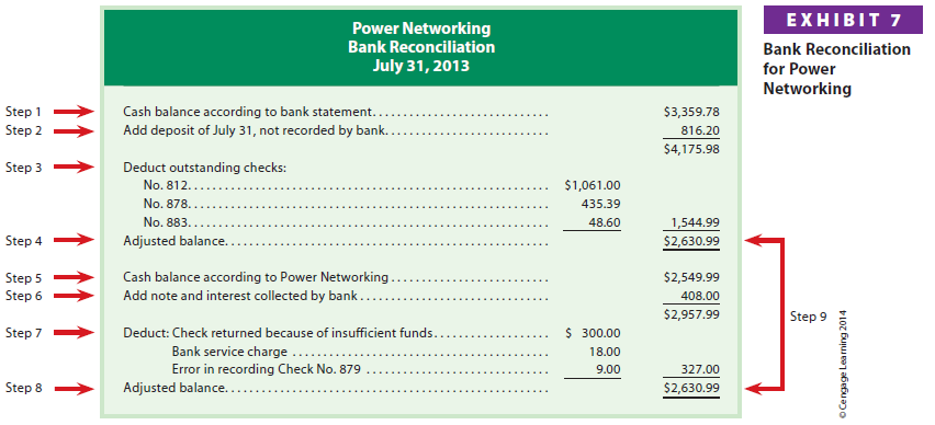 Businesses may reconcile their bank accounts in a slightly different format from that shown in Exhibit 7. Regardless, the objective is to control cash by reconciling the company’s records with the bank statement. In doing so, any errors or misuse of cash may be detected.