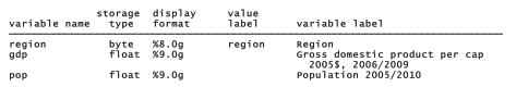 The pie(2, explode) option “explodes” the second pie slice (Americas) for emphasis. plabel(_all sum, format(%4.0f) requests labels for all of the pie slices, giving the sum ofpopmil (that is, the total population in millions) for each region. The pie labels are have format(%4.0f), meaning a fixed numerical format with four digits, none right of the decimal.