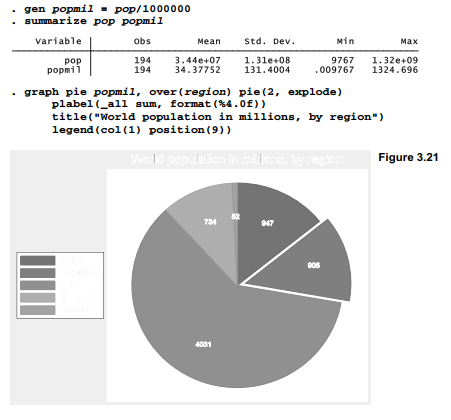 Bar charts can provide clear visualizations of relationships involving many categories and two or more variables. Pie charts, on the other hand, rarely clarify the analysis but are popular for some public presentations. Figure 3.21 illustrates Stata’s graph pie command, showing the breakdown of world population by region. The variable pop ranges from just under 10,000 to 1.32 billion (1.32e+09, meaning 1.32*109 = 1,320,000,000). To make our pie chart readable it helps to create a new variable, popmil or population in millions.