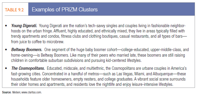Geoclustering captures the increasing diversity of the U.S. population. PRIZM has been used to answer questions such as: Which neighborhoods or zip codes contain our most valuable customers? How deeply have we already penetrated these segments? Which distribution channels and promotional media work best in reaching our target clusters in each area? Barnes & Nobles placed its stores where the “Money & Brains” segment hangs out. Hyundai successfully targeted a promotional campaign to neighborhoods where the “Kids & Cul-de-Sacs,” “Bohemian Mix,” and “Pool & Patios” could be found.4