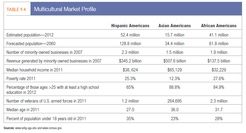 Next, we consider issues in the three largest multicultural markets—Hispanic Americans, African Americans, and Asian Americans. Table 9.4 lists some important facts and figures about them.29