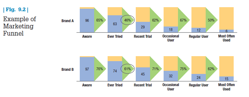 Figure 9.2 displays a funnel for two hypothetical brands. Compared with Brand B, Brand A performs poorly at converting one-time users to more recent users (only 46 percent convert for Brand A compared with 61 percent for Brand B). Depending on the reasons consumers didn’t use again, a marketing campaign could introduce more relevant products, find more accessible retail outlets, or dispel rumors or incorrect beliefs consumers hold.