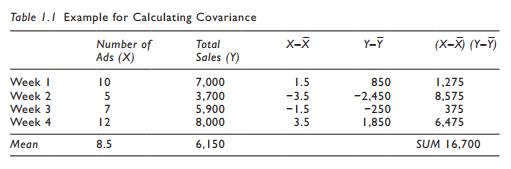 The X–X¯ value for week 1 is the number of ads (10) minus the mean (8.5) over the week = 1.50.You would need to get this value for each week. The Y–Y¯ for week 1 is 7,000 minus the mean 6,150 = 850. Again, you would need to get the value for each week.The next step is to multiply the X–X¯ value by the Y–Y¯ value. If you sum up all these products, you get the numerator for our equation (16,700). The denominator of our equation is the total num- ber of samples subtracted by the value of 1. Thus,