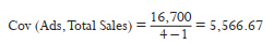 The X–X¯ value for week 1 is the number of ads (10) minus the mean (8.5) over the week = 1.50.You would need to get this value for each week. The Y–Y¯ for week 1 is 7,000 minus the mean 6,150 = 850. Again, you would need to get the value for each week.The next step is to multiply the X–X¯ value by the Y–Y¯ value. If you sum up all these products, you get the numerator for our equation (16,700). The denominator of our equation is the total num- ber of samples subtracted by the value of 1. Thus,