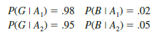 The quality of the purchased parts varies with the source of supply. Historical data suggest that the quality ratings of the two suppliers are as shown in Table 4.6. If we let G denote the event that a part is good and B denote the event that a part is bad, the information in Table 4.6 provides the following conditional probability values.