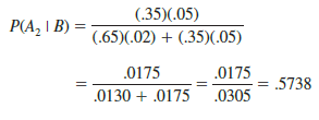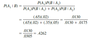 Note that in this application we started with a probability of .65 that a part selected at random was from supplier 1. However, given information that the part is bad, the probability that the part is from supplier 1 drops to .4262. In fact, if the part is bad, it has better than a 50-50 chance that it came from supplier 2; that is, P(A2 I B) = .5738.