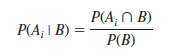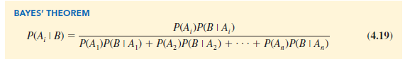 With prior probabilities P(A1), P(A2), . . . , P(An) and the appropriate conditional probabilities P(B I A1), P(B I A2), . . . , P(B I An), equation (4.19) can be used to compute the posterior probability of the events A1, A2, . . . , An.