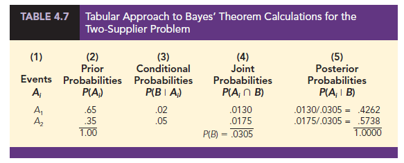 A tabular approach is helpful in conducting the Bayes’ theorem calculations. Such an approach is shown in Table 4.7 for the parts supplier problem. The computations shown there are done in the following steps.