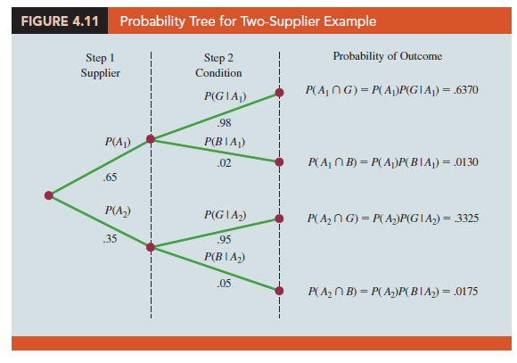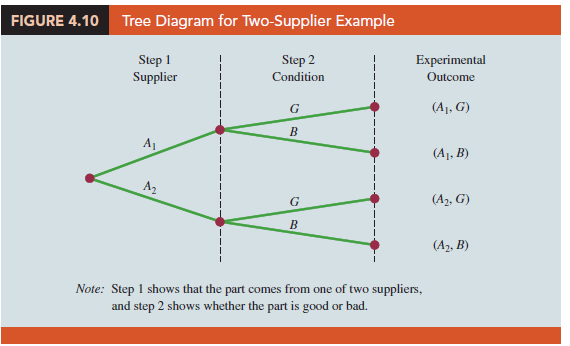 The tree diagram in Figure 4.10 depicts the process of the firm receiving a part from one of the two suppliers and then discovering that the part is good or bad as a two-step experiment. We see that four experimental outcomes are possible; two correspond to the part being good and two correspond to the part being bad.