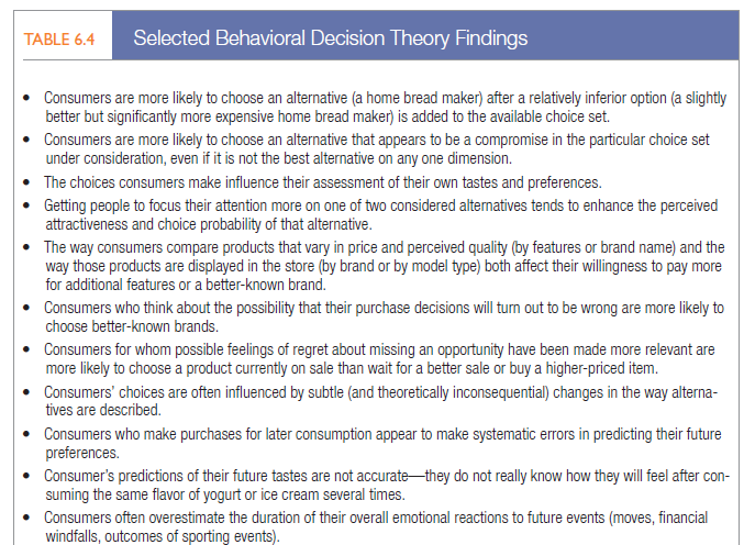 As you might guess from low-involvement decision making and variety seeking, consumers don’t always process information or make decisions in a deliberate, rational manner. One of the most active academic research areas in marketing over the past three decades has been behavioral decision theory (BDT). Behavioral decision theorists have identified many situations in which consumers make seemingly irrational choices. Table 6.4 summarizes some provocative findings from this research.74