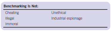 product or processes. Nothing could be further from the truth. Benchmarking involves two organizations that have agreed to share information about processes or operations. The two organizations both anticipate some gain from the exchange of information. Either organization is free to withhold information that is considered proprietary. In addition, the two companies need not be competitors.