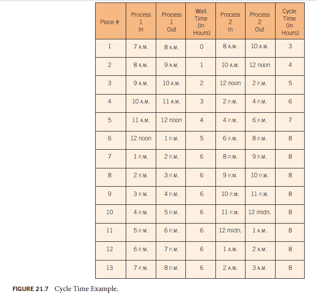 As long as the problem persists, WIP will build, output will stay at one unit every two hours, but cycle time will increase as backlog builds up in front of process 2; the first unit went through the production system in three hours, and one unit per hour was expected after that, but the process is actually achieving one unit every two hours. Cycle time increases by one hour for each piece—for example, eight hours later the sixth unit into process 1 will come out of process 2. Such an imbalance would not escape notice for long, and it would be corrected, but by then, several pieces of WIP would be between the processes.
