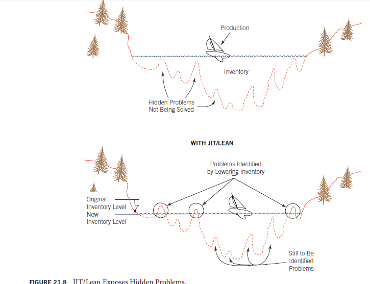 The analogy of a lake better illustrates JIT/Lean’s ability to reveal real problems (see Figure 21.8). You look out over the lake and see the calm, flat surface of the water and perhaps an island or two. From this observation, you conclude that the lake is navigable, so you put your boat in and cast off. You avoid running into the islands because they can be seen plainly and there is plenty of room to steer around them. However, a rock just below the surface is not evident until you crash into it. It turns out there are lots of rocks at various depths, but you can’t see them until it is too late. This is like a traditional factory. The rocks represent problems that will wreak havoc on production (the boat). The water represents all the inventory maintained: raw materials and parts, WIP, and even finished goods. Now if you make the change to just-in-time/Lean, you start reducing those inventories. Every time you remove some, the level of the water in the lake is lowered, revealing problems that had been there all along but that were not eliminated because they couldn’t be seen. You just kept running your boat into them, making repairs, and sailing on to the next encounter. But with the lower water level, the problems become visible and can be eliminated. Clear sailing? Probably not. Other rocks are no doubt just below the new lower surface level, so you have to take some more water out of the lake (remove more inventory), enabling you to identify and eliminate them. Like most analogies, our lake doesn’t hold all the way to the logical conclusion of zero inventory because the lake would be dry by then. But remember, true zero inventory doesn’t hold either. As was said before, it is a target to aim at but never to be fully reached.
