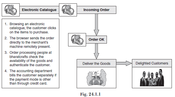 When the site goes in for an e-commerce set-up, the basic architecture will be as shown in Figure 24.1.2. When a customer shopping for handicrafts on the Internet orders an item online using a credit card, the processes that take place are as follows: