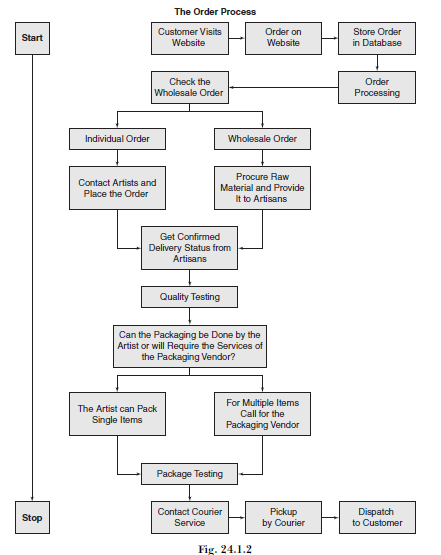 Whenever an order comes to them via the Internet, it gets processed and put into the sales and operations planning (S&OP) system. Here, in this system the order is checked to match it with the names of the craftspersons along with their addresses. The authenticity of the customer is checked by calling the telephone number provided by the customer; and for individual customers by the agents or regional office people. In case it is a bulk order from a dealer, then the reputation of the dealer is verified before placing the order with the craftspeople (see Figure 24.1.1).