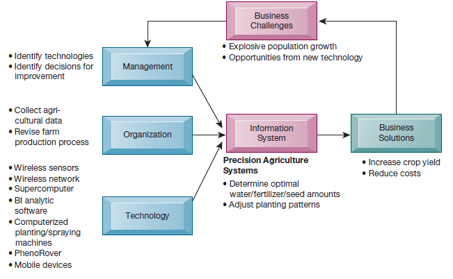 The chapter-opening diagram calls attention to important points raised by this case and this chapter. There is a worldwide need to increase food production, both to feed a rapidly growing global population and to make farms more profitable. Wireless technology and big data analytics create new opportunities for managing crops almost on a plant-by-plant basis. Managing fields with this level of computerized precision means farmers need to use less fertilizer and less seed per unit of land, potentially saving an individual farmer tens of thousands of dollars while increasing crop yields. Precision agriculture may also help solve the world food crisis.