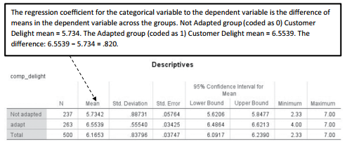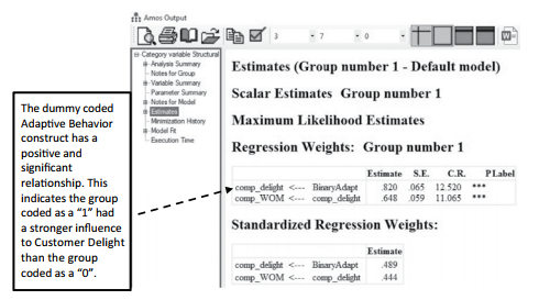 The output in the Estimates link (See Figure 8.2) shows us that the binary variable of Adaptive Behavior to Customer Delight is significant.The unstandardized estimate is .820. You don’t want to look at the standardized estimates with a dummy coded variable. Since the estimate is positive, this means that values coded as a 1 (employees adapted the service) had a stronger effect on Customer Delight than the group coded as a 0 (employees did not adapt the service). If the unstandardized coefficient was a negative, this would mean the group coded as a “0” had a stronger relationship to Customer Delight. To add greater con- text to these findings, the regression coefficient of the binary variable is nothing more than the mean difference of the Customer Delight construct across the groups. If you examine the mean of Customer Delight for the group that adapted the service and the group that did not adapt the service, the difference of those values is the regression coefficient of the binary variable in AMOS.