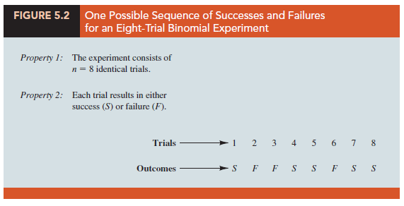 If properties 2, 3, and 4 are present, we say the trials are generated by a Bernoulli process. If, in addition, property 1 is present, we say we have a binomial experiment. Figure 5.2 depicts one possible sequence of successes and failures for a binomial experiment involving eight trials.