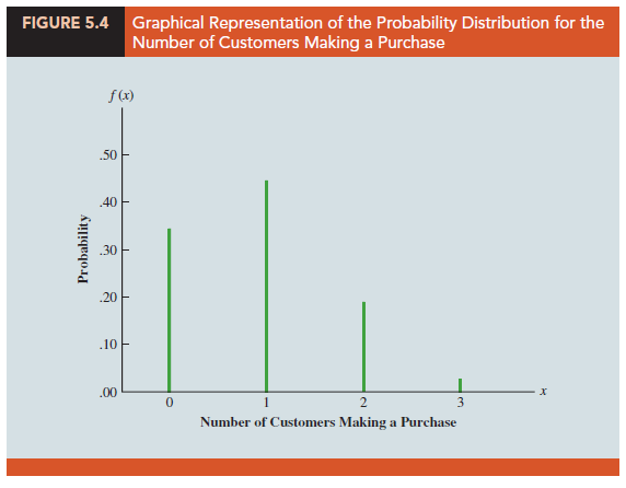 In the Martin Clothing Store example, let us use equation (5.12) to compute the probability that no customer makes a purchase, exactly one customer makes a purchase, exactly two customers make a purchase, and all three customers make a purchase. The calculations are summarized in Table 5.13, which gives the probability distribution of the number of customers making a purchase. Figure 5.4 is a graph of this probability distribution.
