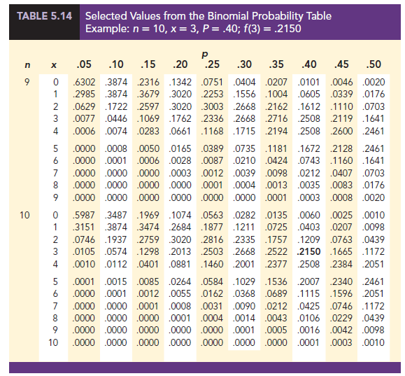 Tables have been developed that give the probability of x successes in n trials for a binomial experiment. The tables are generally easy to use and quicker than equation (5.12). Table 5 of Appendix B provides such a table of binomial probabilities. A portion of this table appears in Table 5.14. To use this table, we must specify the values of n, p, and x for the binomial experiment of interest. In the example at the top of Table 5.14, we see that the probability of x = 3 successes in a binomial experiment with n = 10 and p = .40 is .2150. You can use equation (5.12) to verify that you would obtain the same answer if you used the binomial probability function directly.