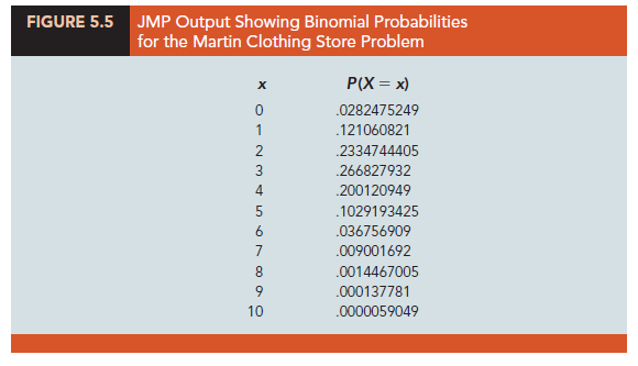 Statistical software packages also provide a capability for computing binomial probabilities. Consider the Martin Clothing Store example with n = 10 and p = .30. Figure 5.5 shows the binomial probabilities generated by JMP for all possible values of x. Note that these values are the same as those found in the p = .30 column of Table 5.14. The chapter appendices contain step-by-step instructions for using widely available software packages to generate binomial probabilities.