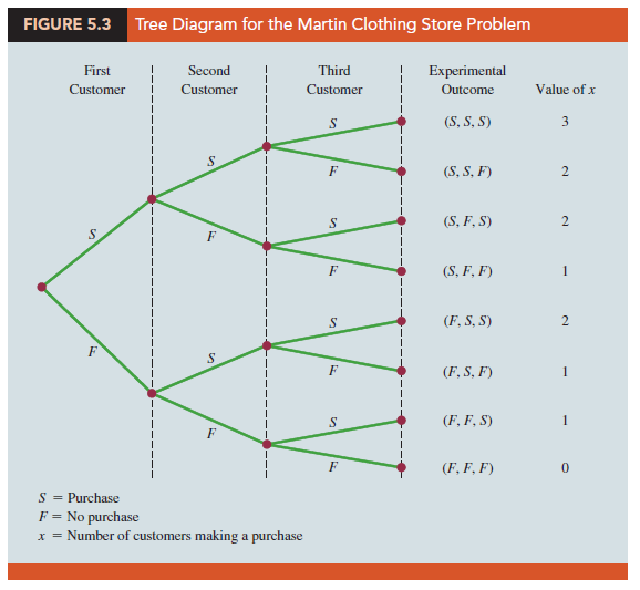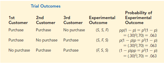 Using a tree diagram (Figure 5.3), we can see that the experiment of observing the three customers each making a purchase decision has eight possible outcomes. Using S to denote success (a purchase) and F to denote failure (no purchase), we are interested in experimental outcomes involving two successes in the three trials (purchase decisions). Next, let us verify that the experiment involving the sequence of three purchase decisions can be viewed as a binomial experiment. Checking the four requirements for a binomial experiment, we note that: