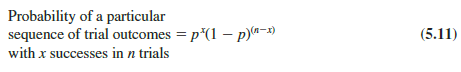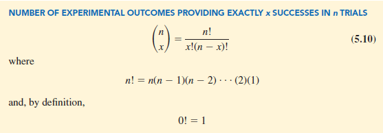 We know that equation (5.10) can be used to determine the number of experimental outcomes that result in x successes in n trials. If we are to determine the probability of x successes in n trials, however, we must also know the probability associated with each of these experimental outcomes. Because the trials of a binomial experiment are independent, we can simply multiply the probabilities associated with each trial outcome to find the probability of a particular sequence of successes and failures.