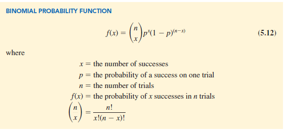 The binomial probability function can be applied to any binomial experiment. If we are satisfied that a situation demonstrates the properties of a binomial experiment and if we know the values of n and p, we can use equation (5.12) to compute the probability of x successes in the n trials.